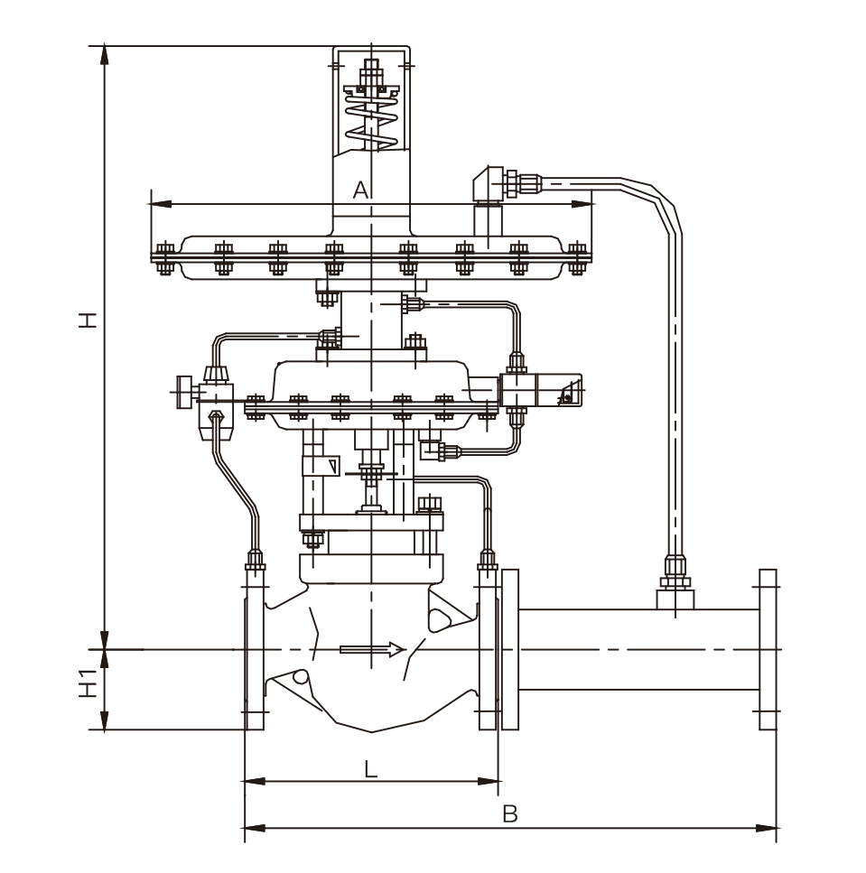 自力式帶指揮器壓力調(diào)節(jié)閥(即氮封裝置)主要用于儲罐頂部氮氣壓力恒定控制,自力式氮封閥是一種無須外來能源,以彈簧為動力核心利用被調(diào)介質(zhì)自身的壓力來控制閥芯位置變化,達到自動調(diào)節(jié)和穩(wěn)定壓力的目的,以保護罐內(nèi)物料不被氮化及儲罐的安全。該閥由ZZYVP快速泄放閥及ZZV自力式微壓調(diào)節(jié)閥兩大部分組成。快速泄放閥由壓力控制器及ZMQ-16K型單座切斷閥組成。